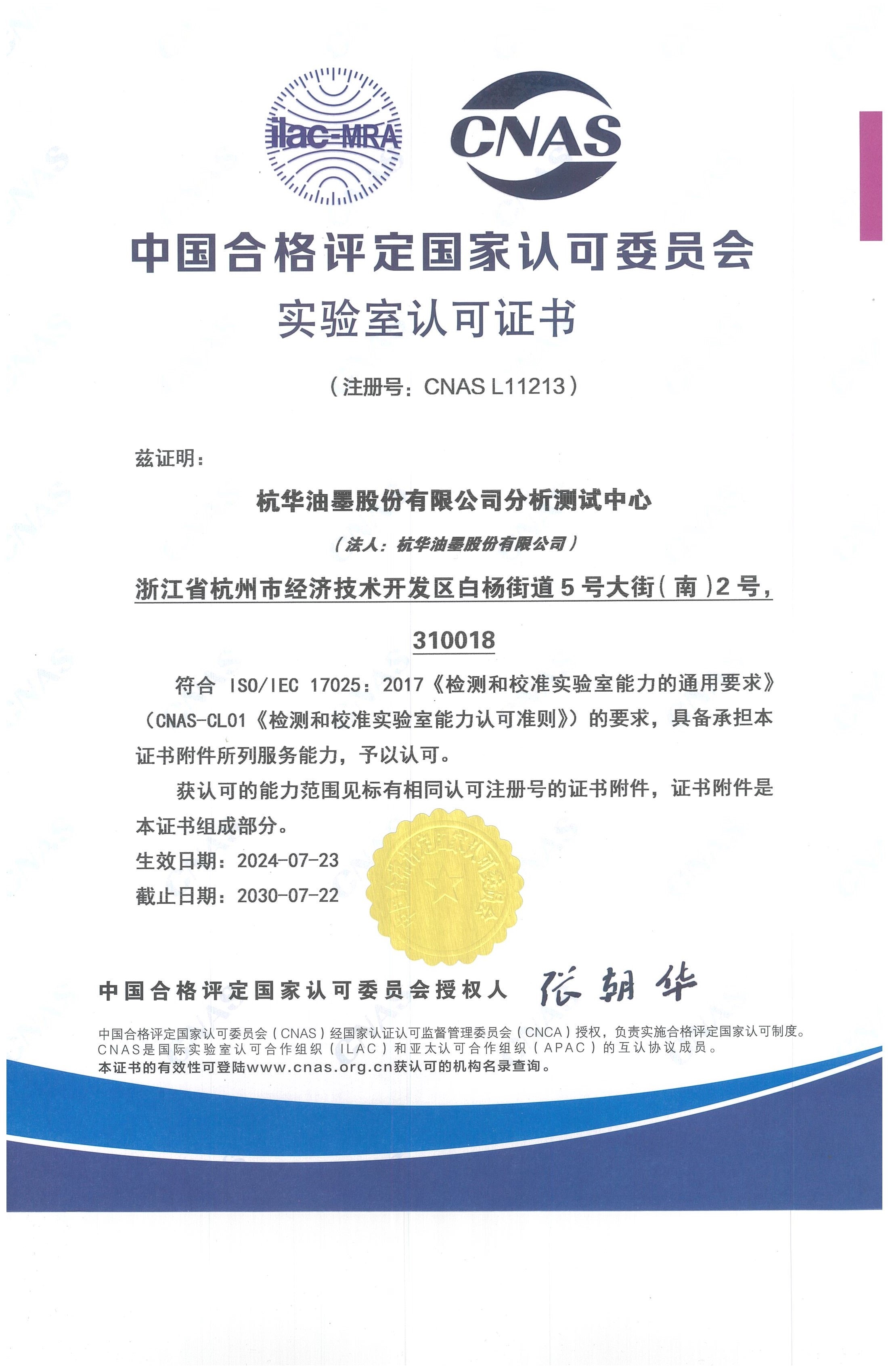 中國合格評定國家認可委員會實驗室認可證書(CNAS)
